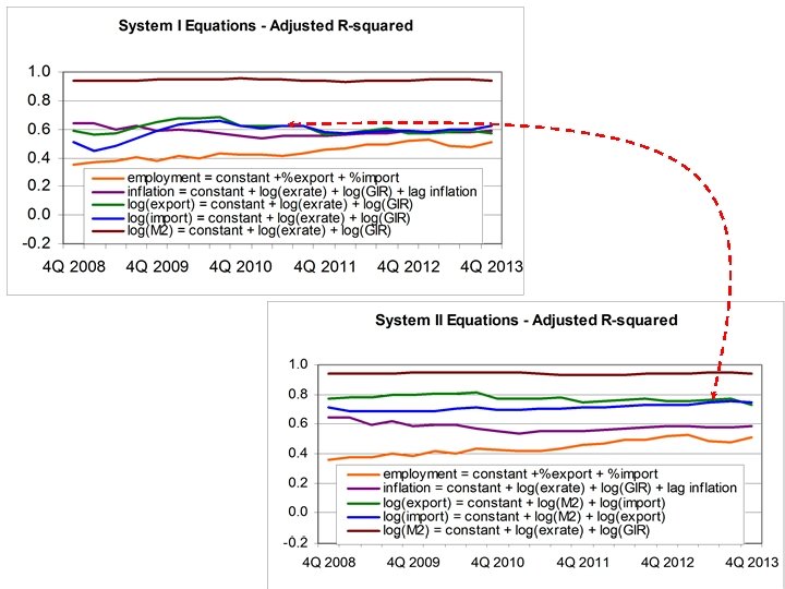 SYSTEM I EQUATIONS log(M 2) = constant + log(exchange rate) + log(GIR) [22] inflation = constant + log(exchange rate) + log(GIR) + inflation t-1 [23] log(export) = constant + log(exchange rate) + log(GIR) [24 a] log(import) = constant + log(exchange rate) + log(GIR) [25 a] employment = constant + %export + %import. [26] SYSTEM II EQUATIONS log(M 2) = constant + log(exchange rate) + log(GIR) inflation = constant + log(exchange rate) + log(GIR) + inflation t-1 log(exports) = constant + log(M 2) + log(imports) = constant + log(M 2) + log(exports) employment = constant + %export + %import. [22] [23] [24 b] [25 b] [26]
