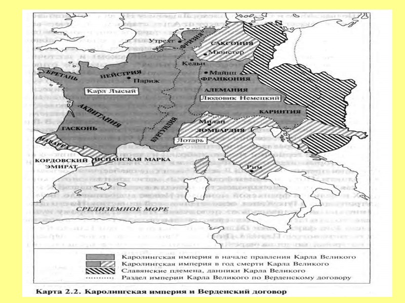 843 г. Три внука Карла Великого – Лотарь, Людовик Немецкий и Карл Лысый заключили договор о разделе империи.