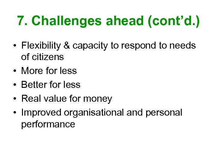 7. Challenges ahead (cont’d. ) • Flexibility & capacity to respond to needs of citizens • More for less • Better for less • Real value for money • Improved organisational and personal performance