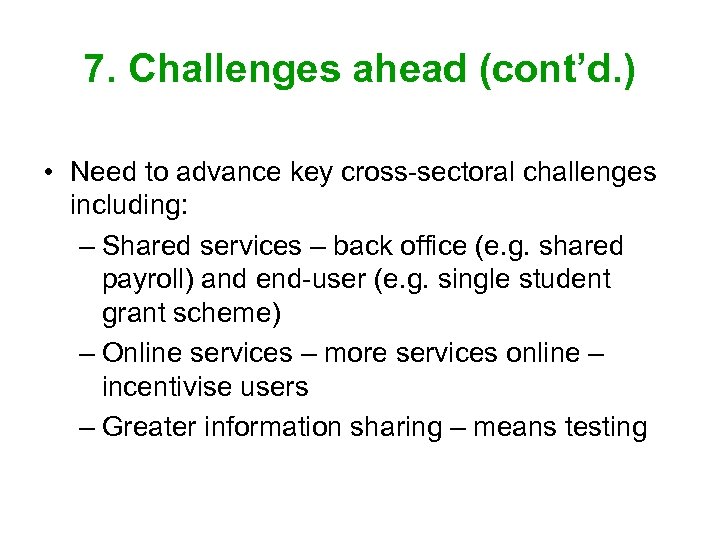 7. Challenges ahead (cont’d. ) • Need to advance key cross-sectoral challenges including: – Shared services – back office (e. g. shared payroll) and end-user (e. g. single student grant scheme) – Online services – more services online – incentivise users – Greater information sharing – means testing