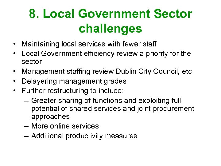 7. Challenges ahead • Further significant reductions in staff numbers – Programme for Government commitments – Reduction of between 18, 000 -21, 000 by 2014 over end 2010 levels and a further 4, 000 by 2015 • Some decisions made e. g. – VECs reduction – Merging of employment rights bodies – Amalgamation of Local Authorities: • North and South Tipperary • Limerick City and County