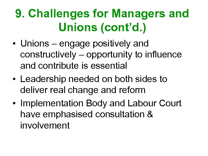 9. Challenges for Managers and Unions (cont’d. ) • Unions – engage positively and constructively – opportunity to influence and contribute is essential • Leadership needed on both sides to deliver real change and reform • Implementation Body and Labour Court have emphasised consultation & involvement