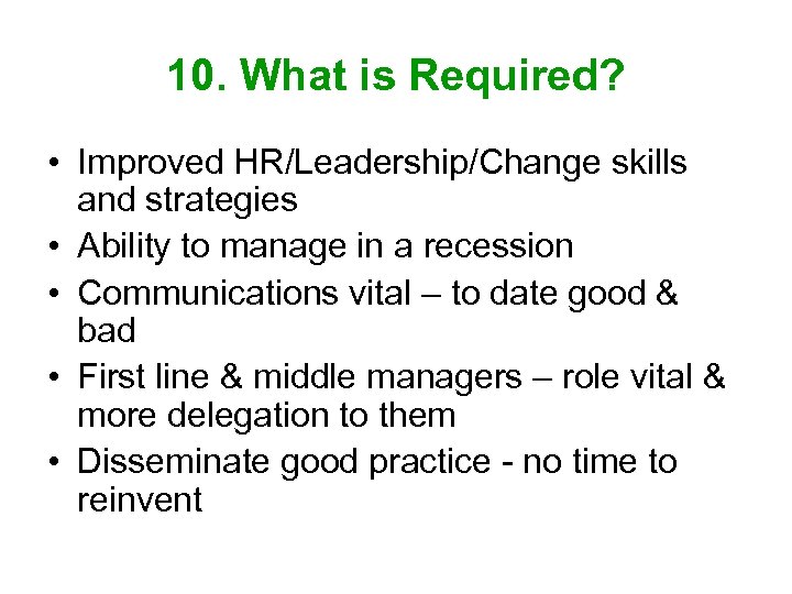 10. What is Required? • Improved HR/Leadership/Change skills and strategies • Ability to manage in a recession • Communications vital – to date good & bad • First line & middle managers – role vital & more delegation to them • Disseminate good practice - no time to reinvent