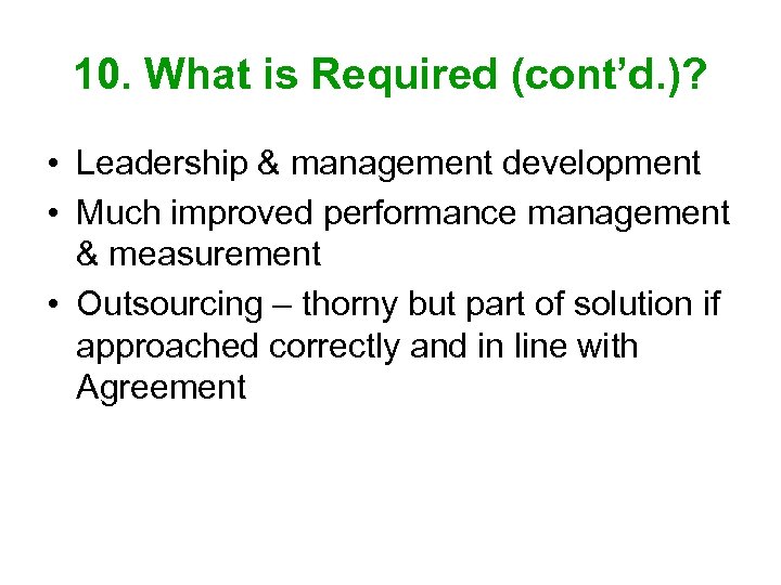 10. What is Required (cont’d. )? • Leadership & management development • Much improved performance management & measurement • Outsourcing – thorny but part of solution if approached correctly and in line with Agreement