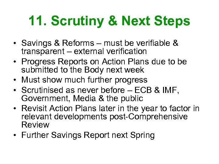 11. Scrutiny & Next Steps • Savings & Reforms – must be verifiable & transparent – external verification • Progress Reports on Action Plans due to be submitted to the Body next week • Must show much further progress • Scrutinised as never before – ECB & IMF, Government, Media & the public • Revisit Action Plans later in the year to factor in relevant developments post-Comprehensive Review • Further Savings Report next Spring