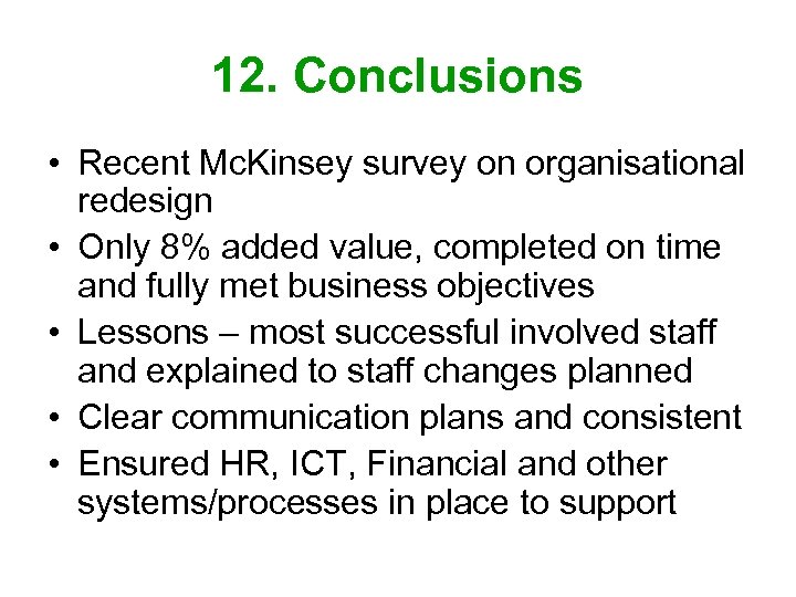 12. Conclusions • Recent Mc. Kinsey survey on organisational redesign • Only 8% added value, completed on time and fully met business objectives • Lessons – most successful involved staff and explained to staff changes planned • Clear communication plans and consistent • Ensured HR, ICT, Financial and other systems/processes in place to support