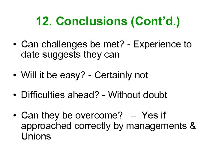12. Conclusions (Cont’d. ) • Can challenges be met? - Experience to date suggests they can • Will it be easy? - Certainly not • Difficulties ahead? - Without doubt • Can they be overcome? – Yes if approached correctly by managements & Unions