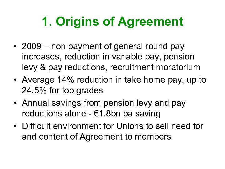 1. Origins of Agreement • 2009 – non payment of general round pay increases, reduction in variable pay, pension levy & pay reductions, recruitment moratorium • Average 14% reduction in take home pay, up to 24. 5% for top grades • Annual savings from pension levy and pay reductions alone - € 1. 8 bn pa saving • Difficult environment for Unions to sell need for and content of Agreement to members