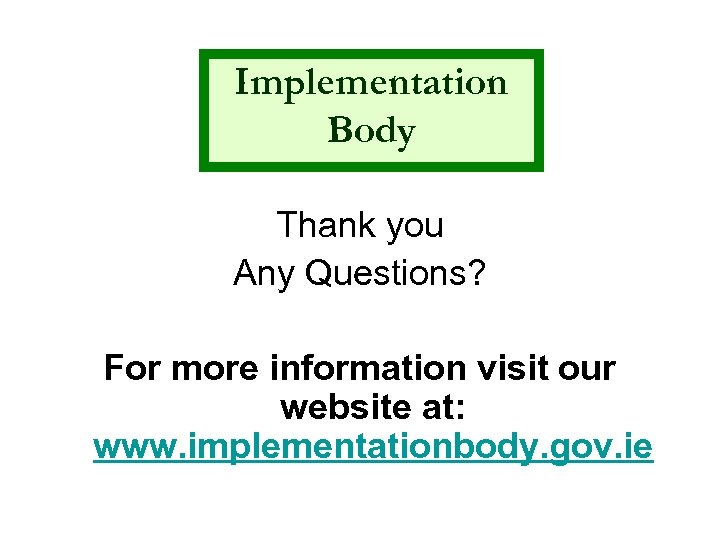 Implementation Body Thank you Any Questions? For more information visit our website at: www. implementationbody. gov. ie