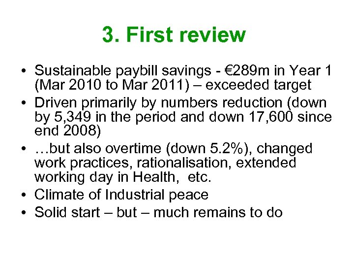 3. First review • Sustainable paybill savings - € 289 m in Year 1 (Mar 2010 to Mar 2011) – exceeded target • Driven primarily by numbers reduction (down by 5, 349 in the period and down 17, 600 since end 2008) • …but also overtime (down 5. 2%), changed work practices, rationalisation, extended working day in Health, etc. • Climate of Industrial peace • Solid start – but – much remains to do