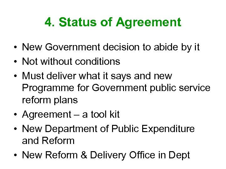 4. Status of Agreement • New Government decision to abide by it • Not without conditions • Must deliver what it says and new Programme for Government public service reform plans • Agreement – a tool kit • New Department of Public Expenditure and Reform • New Reform & Delivery Office in Dept