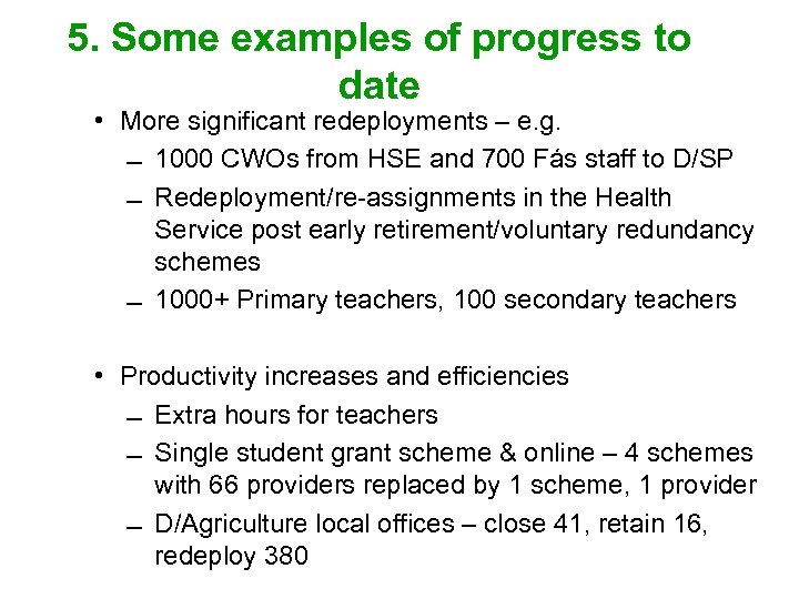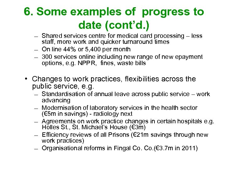 5. Some examples of progress to date • More significant redeployments – e. g. 1000 CWOs from HSE and 700 Fás staff to D/SP Redeployment/re-assignments in the Health Service post early retirement/voluntary redundancy schemes 1000+ Primary teachers, 100 secondary teachers • Productivity increases and efficiencies Extra hours for teachers Single student grant scheme & online – 4 schemes with 66 providers replaced by 1 scheme, 1 provider D/Agriculture local offices – close 41, retain 16, redeploy 380