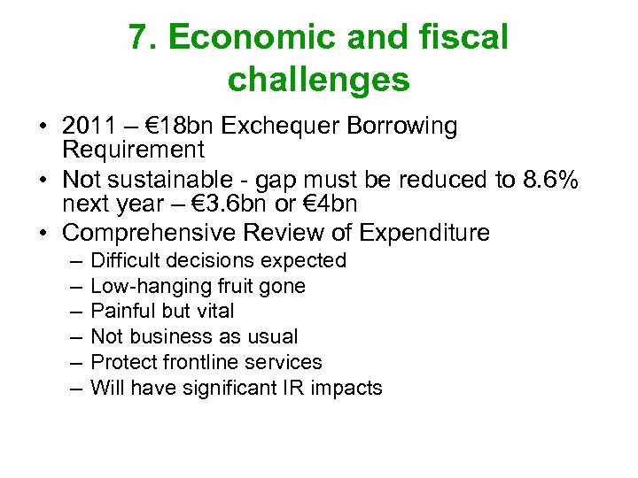7. Economic and fiscal challenges • 2011 – € 18 bn Exchequer Borrowing Requirement • Not sustainable - gap must be reduced to 8. 6% next year – € 3. 6 bn or € 4 bn • Comprehensive Review of Expenditure – – – Difficult decisions expected Low-hanging fruit gone Painful but vital Not business as usual Protect frontline services Will have significant IR impacts
