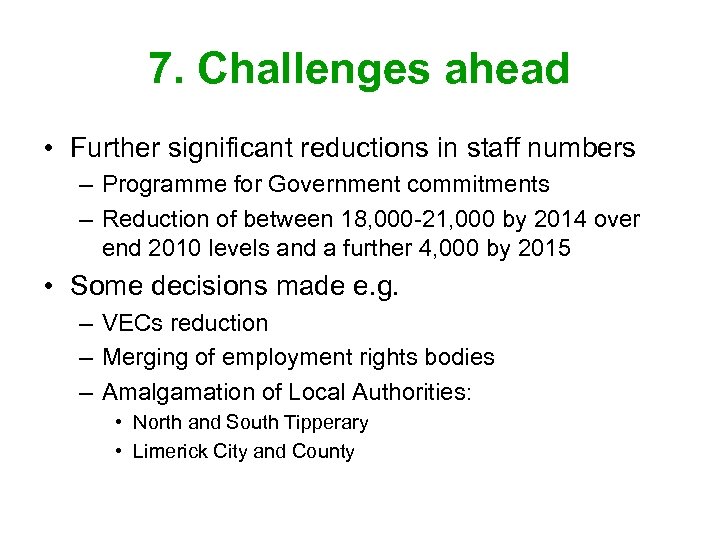 6. Some examples of progress to date (cont’d. ) Shared services centre for medical card processing – less staff, more work and quicker turnaround times On line 44% or 5, 400 per month 300 services online including new range of new epayment options, e. g. NPPR, fines, waste bills • Changes to work practices, flexibilities across the public service, e. g. Standardisation of annual leave across public service – work advancing Modernisation of laboratory services in the health sector (€ 5 m in savings) - radiology next Agreements on work practice changes in certain hospitals e. g. Holles St. , St. Michael’s House (€ 3 m) Efficiency reviews of all Prisons (€ 21 m savings through new work practices) Organisational reforms in Fingal Co. (€ 3. 7 m in 2011)