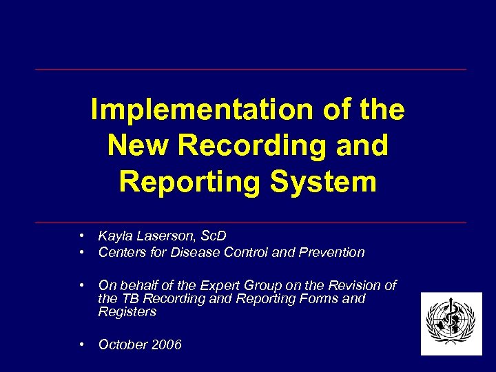 Implementation of the New Recording and Reporting System • Kayla Laserson, Sc. D • Centers for Disease Control and Prevention • On behalf of the Expert Group on the Revision of the TB Recording and Reporting Forms and Registers • October 2006