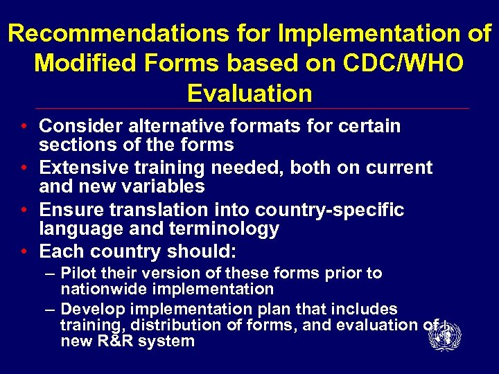 Recommendations for Implementation of Modified Forms based on CDC/WHO Evaluation • Consider alternative formats for certain sections of the forms • Extensive training needed, both on current and new variables • Ensure translation into country-specific language and terminology • Each country should: – Pilot their version of these forms prior to nationwide implementation – Develop implementation plan that includes training, distribution of forms, and evaluation of new R&R system
