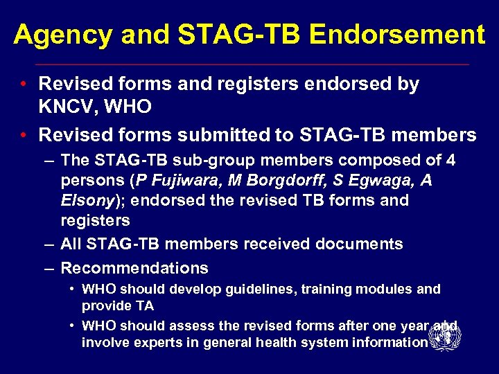 Agency and STAG-TB Endorsement • Revised forms and registers endorsed by KNCV, WHO • Revised forms submitted to STAG-TB members – The STAG-TB sub-group members composed of 4 persons (P Fujiwara, M Borgdorff, S Egwaga, A Elsony); endorsed the revised TB forms and registers – All STAG-TB members received documents – Recommendations • WHO should develop guidelines, training modules and provide TA • WHO should assess the revised forms after one year and involve experts in general health system information