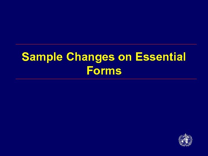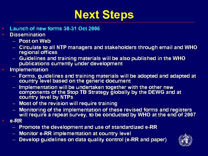 Next Steps • • Launch of new forms 30 -31 Oct 2006 Dissemination – Post on Web – Circulate to all NTP managers and stakeholders through email and WHO regional offices – Guidelines and training materials will be also published in the WHO publications currently under development Implementation – Forms, guidelines and training materials will be adopted and adapted at country level based on the generic document – Implementation will be undertaken together with the other new components of the Stop TB Strategy globally by the DEWG and at country level by NTPs – Most of the revision will require training – Monitoring of the implementation of these revised forms and registers will require a repeat survey, to be conducted by WHO at the end of 2007 e-RR – Promote the development and use of standardized e-RR – Monitor e-RR implementation at country level – Develop guidelines on data quality control (e-RR and paper)