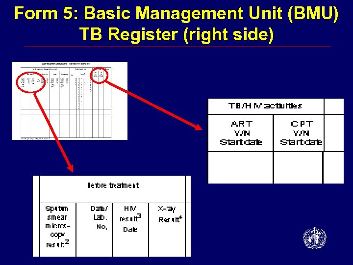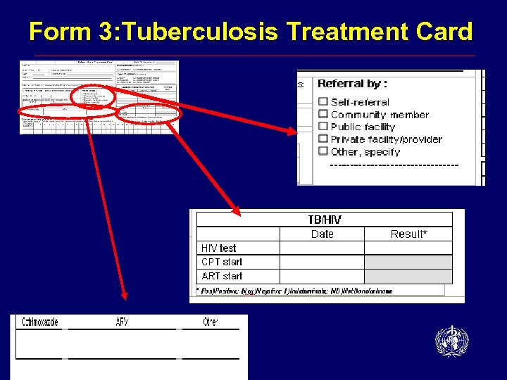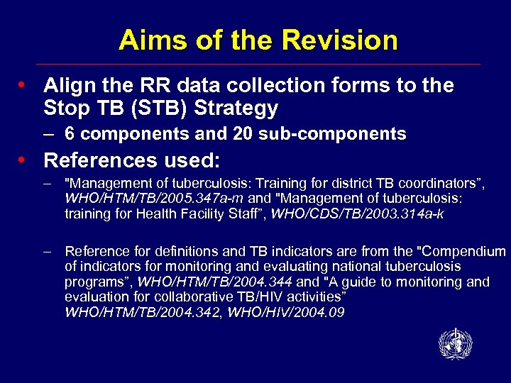 Aims of the Revision • Align the RR data collection forms to the Stop TB (STB) Strategy – 6 components and 20 sub-components • References used: – "Management of tuberculosis: Training for district TB coordinators”, WHO/HTM/TB/2005. 347 a-m and "Management of tuberculosis: training for Health Facility Staff”, WHO/CDS/TB/2003. 314 a-k – Reference for definitions and TB indicators are from the "Compendium of indicators for monitoring and evaluating national tuberculosis programs”, WHO/HTM/TB/2004. 344 and "A guide to monitoring and evaluation for collaborative TB/HIV activities” WHO/HTM/TB/2004. 342, WHO/HIV/2004. 09