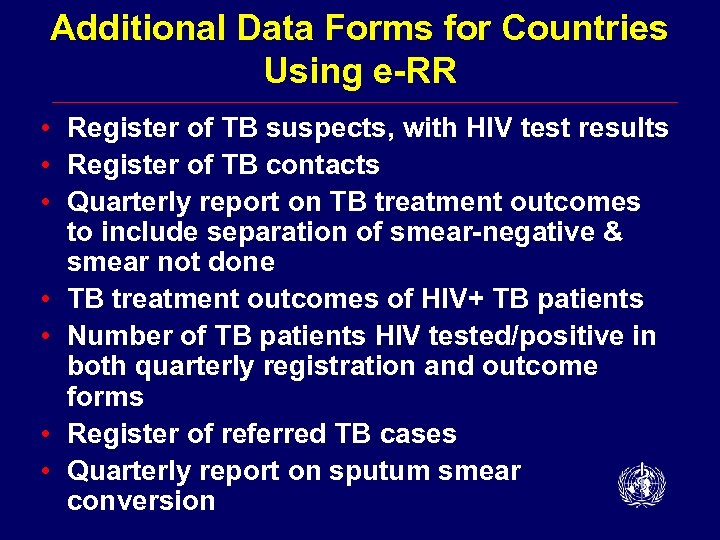 Additional Data Forms for Countries Using e-RR • Register of TB suspects, with HIV test results • Register of TB contacts • Quarterly report on TB treatment outcomes to include separation of smear-negative & smear not done • TB treatment outcomes of HIV+ TB patients • Number of TB patients HIV tested/positive in both quarterly registration and outcome forms • Register of referred TB cases • Quarterly report on sputum smear conversion