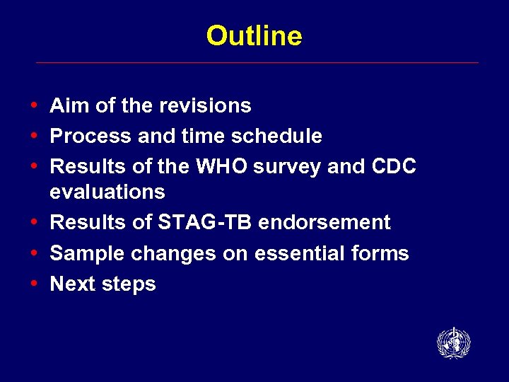 Outline • Aim of the revisions • Process and time schedule • Results of the WHO survey and CDC evaluations • Results of STAG-TB endorsement • Sample changes on essential forms • Next steps