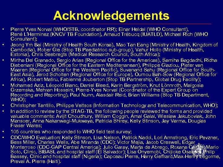 Acknowledgements • • Pierre Yves Norval (WHO/STB, coordinator RR); Einar Heldal (WHO Consultant), René L’Herminez (KNCV TB Foundation), Arnaud Trébucq (IUATLD), Michael Rich (WHO Consultant); Jeong Ym Bai (Ministry of Health South Korea), Mao Tan Eang (Ministry of Health, Kingdom of Cambodia), Rober Gie (Stop TB Paediatrioc sub-group), Vahur Hollo (Ministry of Health, Estonia), Chris Seebregts (Medical Research Council, South Africa); Mirtha Del Granado, Sergio Arias (Regional Office for the Americas), Samiha Bagdadhi, Ridha Djebeniani (Regional Office for the Eastern Mediterranean), Philippe Glaziou, Pieter van Maaren (Regional Office for the Western Pacific), Suvanand Sahu (Regional Office for South. East Asia), Jerod Scholten (Regional Office for Europe), Oumou Bah-Sow (Regional Office for Africa), Robert Matiru, Fabienne Jouberton (Stop TB Partnership, Global Drug Facility); Mohamed Aziz, Léopold Blanc, Daniel Bleed, Karin Bergström, Knut Lönnroth, Malgosia Grzemska, Mehran Hosseini, Pierre-Yves Norval (Coordinator of the Expert Group on Recording and Reporting), Paul Nunn, Alasdair Reid, Brian Williams (Stop TB Department, WHO); Christopher Tantillo, Philippe Veltsos (Information Technology and Telecommunication, WHO); In addition to review by the STAG-TB, the following people reviewed the forms and provided valuable comments: Avijit Choudhury, William Coggin, Amal Galal, Wieslaw Jakuboviak, John Mansoer, Anna Nakanwagi-Mukwaya, Patricia Shirey, Kelly Stinson, Jay Varma, Douglas Fraser Wares; 105 countries who responded to WHO field test survey; CDC/WHO Evaluation: Kelly Stinson, Lisa Nelson, Patrick Nadol, Lori Armstrong, Eric Pevzner, Bess Miller, Charles Wells, Abe Miranda (CDC); Victor Mejia, Jacob Creswell, Edgar Monterroso (CDC-GAP Central America); Julio Garay, Marta de Abrego, Roxana Castro, Mario Soto, Clinic, SIBASI, and hospital staff (El Salvador); Lisa Onyemobi, Chijioke Osakwe, Philip Bassey, Clinic and hospital staff (Nigeria); Capceau Pierre, Harry Geffrard, Max-Henry Legorme, Preval A. Pierre (Haiti).