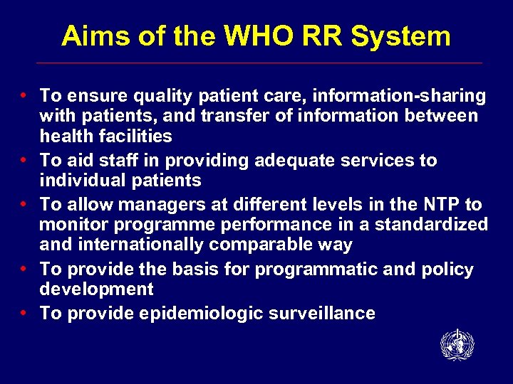 Aims of the WHO RR System • To ensure quality patient care, information-sharing with patients, and transfer of information between health facilities • To aid staff in providing adequate services to individual patients • To allow managers at different levels in the NTP to monitor programme performance in a standardized and internationally comparable way • To provide the basis for programmatic and policy development • To provide epidemiologic surveillance