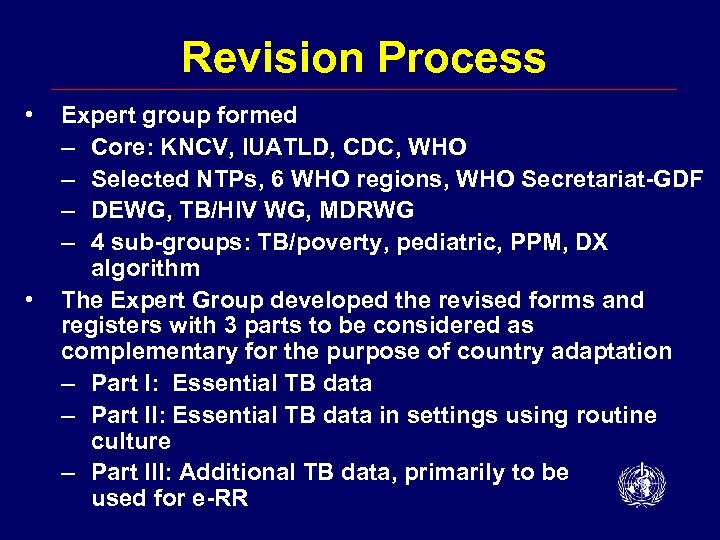 Revision Process • • Expert group formed – Core: KNCV, IUATLD, CDC, WHO – Selected NTPs, 6 WHO regions, WHO Secretariat-GDF – DEWG, TB/HIV WG, MDRWG – 4 sub-groups: TB/poverty, pediatric, PPM, DX algorithm The Expert Group developed the revised forms and registers with 3 parts to be considered as complementary for the purpose of country adaptation – Part I: Essential TB data – Part II: Essential TB data in settings using routine culture – Part III: Additional TB data, primarily to be used for e-RR