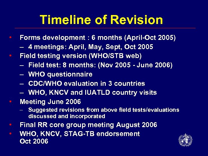 Timeline of Revision • • • Forms development : 6 months (April-Oct 2005) – 4 meetings: April, May, Sept, Oct 2005 Field testing version (WHO/STB web) – Field test: 8 months: (Nov 2005 - June 2006) – WHO questionnaire – CDC/WHO evaluation in 3 countries – WHO, KNCV and IUATLD country visits Meeting June 2006 - Suggested revisions from above field tests/evaluations discussed and incorporated • • Final RR core group meeting August 2006 WHO, KNCV, STAG-TB endorsement Oct 2006
