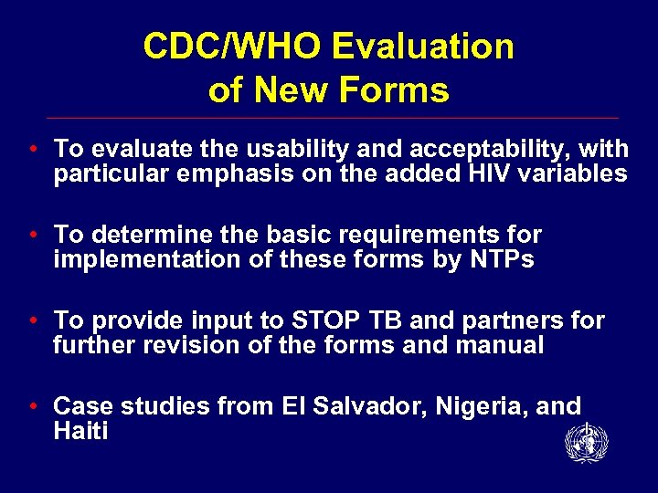 CDC/WHO Evaluation of New Forms • To evaluate the usability and acceptability, with particular emphasis on the added HIV variables • To determine the basic requirements for implementation of these forms by NTPs • To provide input to STOP TB and partners for further revision of the forms and manual • Case studies from El Salvador, Nigeria, and Haiti