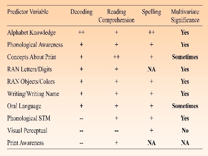 Alphabetic knowledge Unique predictor/strong relationship— average r for decoding was. 5 indicating it accounts for 25% of the variation in decoding performance