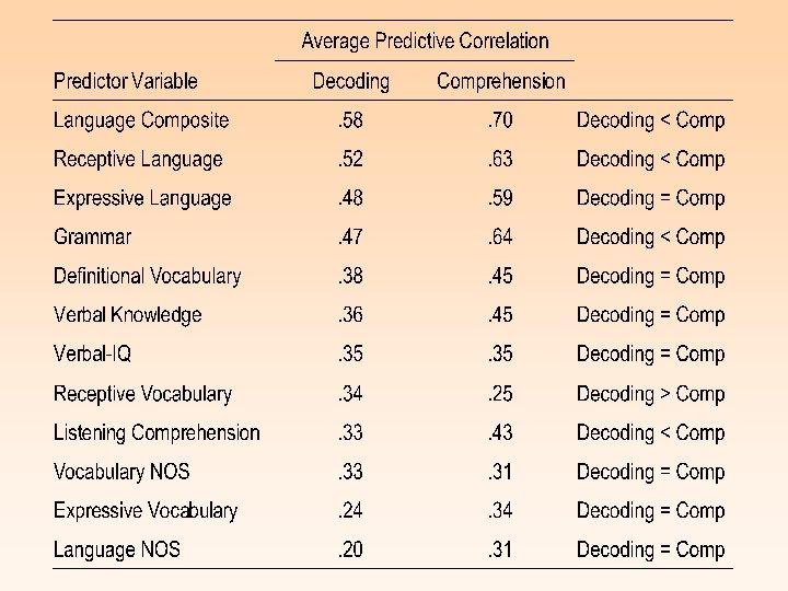 NELP Correlative information regarding early predictive skills and later – decoding – comprehension – spelling