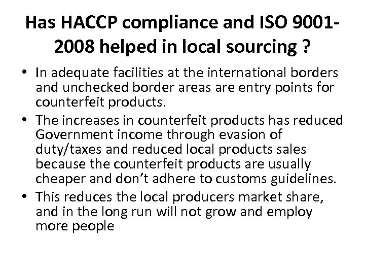 Has HACCP compliance and ISO 90012008 helped in local sourcing ? • In adequate facilities at the international borders and unchecked border areas are entry points for counterfeit products. • The increases in counterfeit products has reduced Government income through evasion of duty/taxes and reduced local products sales because the counterfeit products are usually cheaper and don’t adhere to customs guidelines. • This reduces the local producers market share, and in the long run will not grow and employ more people