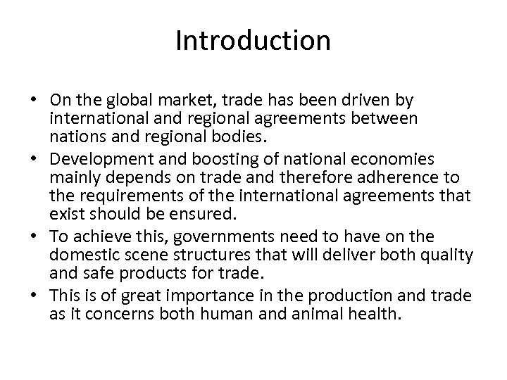 Introduction • On the global market, trade has been driven by international and regional agreements between nations and regional bodies. • Development and boosting of national economies mainly depends on trade and therefore adherence to the requirements of the international agreements that exist should be ensured. • To achieve this, governments need to have on the domestic scene structures that will deliver both quality and safe products for trade. • This is of great importance in the production and trade as it concerns both human and animal health.