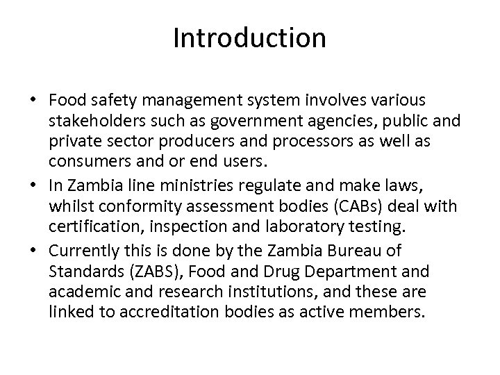 Introduction • Food safety management system involves various stakeholders such as government agencies, public and private sector producers and processors as well as consumers and or end users. • In Zambia line ministries regulate and make laws, whilst conformity assessment bodies (CABs) deal with certification, inspection and laboratory testing. • Currently this is done by the Zambia Bureau of Standards (ZABS), Food and Drug Department and academic and research institutions, and these are linked to accreditation bodies as active members.