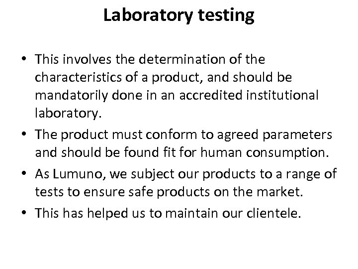 Laboratory testing • This involves the determination of the characteristics of a product, and should be mandatorily done in an accredited institutional laboratory. • The product must conform to agreed parameters and should be found fit for human consumption. • As Lumuno, we subject our products to a range of tests to ensure safe products on the market. • This has helped us to maintain our clientele.