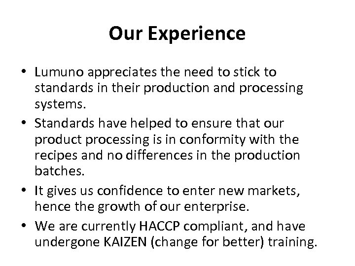 Our Experience • Lumuno appreciates the need to stick to standards in their production and processing systems. • Standards have helped to ensure that our product processing is in conformity with the recipes and no differences in the production batches. • It gives us confidence to enter new markets, hence the growth of our enterprise. • We are currently HACCP compliant, and have undergone KAIZEN (change for better) training.
