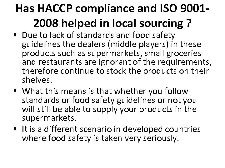 Has HACCP compliance and ISO 90012008 helped in local sourcing ? • Due to lack of standards and food safety guidelines the dealers (middle players) in these products such as supermarkets, small groceries and restaurants are ignorant of the requirements, therefore continue to stock the products on their shelves. • What this means is that whether you follow standards or food safety guidelines or not you will still be able to supply your products in the supermarkets. • It is a different scenario in developed countries where food safety is taken very seriously.