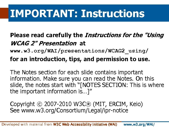 IMPORTANT: Instructions Please read carefully the Instructions for the "Using WCAG 2" Presentation at www. w 3. org/WAI/presentations/WCAG 2_using/ for an introduction, tips, and permission to use. The Notes section for each slide contains important information. Make sure you can read the Notes. On this slide, the notes start with “[NOTES SECTION: This is where the important information is…]” Copyright © 2007 -2010 W 3 C® (MIT, ERCIM, Keio) See www. w 3. org/Consortium/Legal/ipr-notice Developed with material from W 3 C Web Accessibility Initiative (WAI) www. w 3. org/WAI/