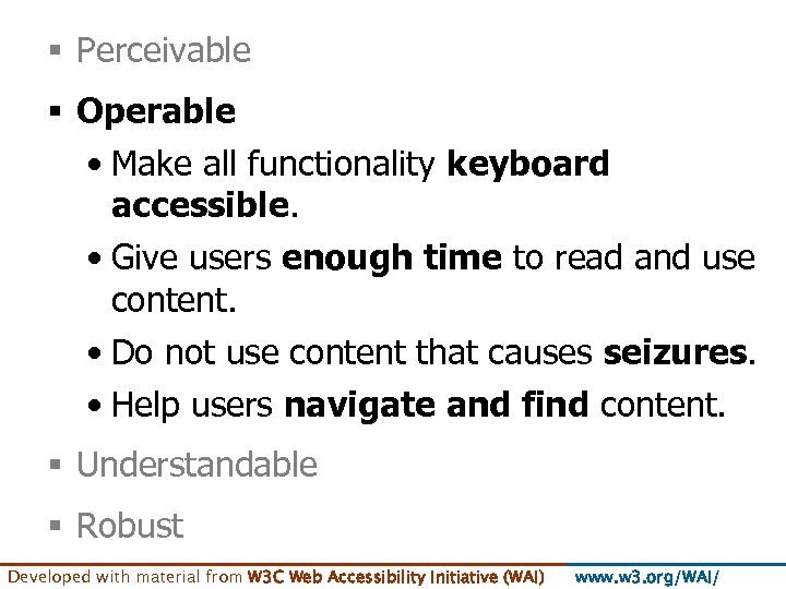 § Perceivable § Operable • Make all functionality keyboard accessible. • Give users enough time to read and use content. • Do not use content that causes seizures. • Help users navigate and find content. § Understandable § Robust Developed with material from W 3 C Web Accessibility Initiative (WAI) www. w 3. org/WAI/