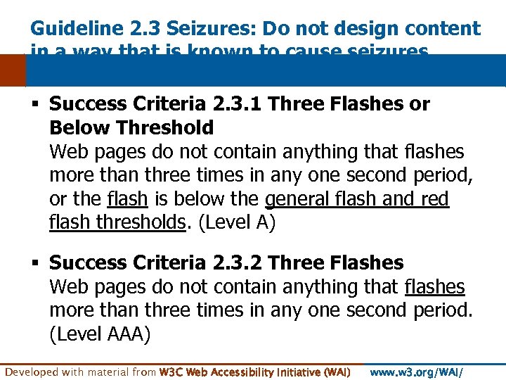 Guideline 2. 3 Seizures: Do not design content in a way that is known to cause seizures. § Success Criteria 2. 3. 1 Three Flashes or Below Threshold Web pages do not contain anything that flashes more than three times in any one second period, or the flash is below the general flash and red flash thresholds. (Level A) § Success Criteria 2. 3. 2 Three Flashes Web pages do not contain anything that flashes more than three times in any one second period. (Level AAA) Developed with material from W 3 C Web Accessibility Initiative (WAI) www. w 3. org/WAI/