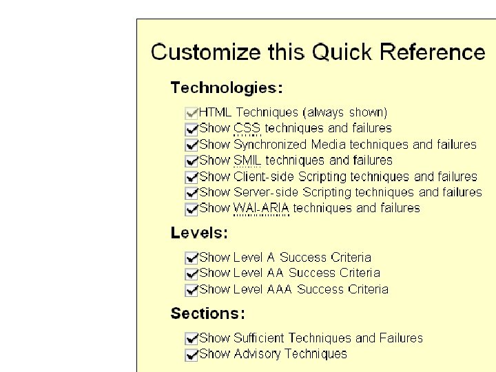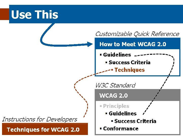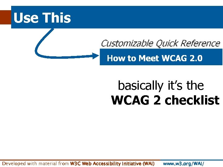 Use This basically it’s the WCAG 2 checklist Developed with material from W 3 C Web Accessibility Initiative (WAI) www. w 3. org/WAI/