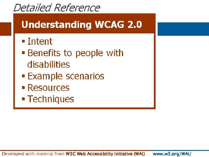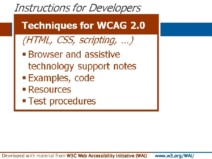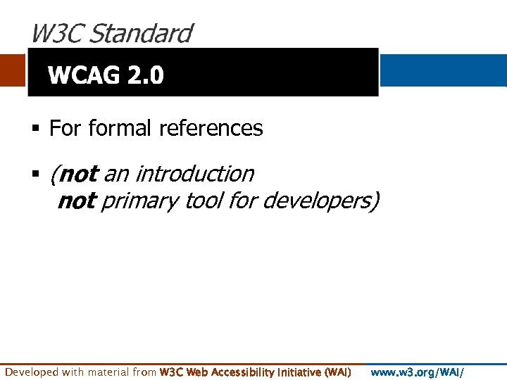 § For formal references § (not an introduction not primary tool for developers) Developed with material from W 3 C Web Accessibility Initiative (WAI) www. w 3. org/WAI/
