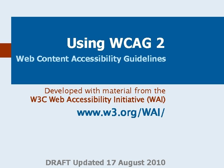 Using WCAG 2 Web Content Accessibility Guidelines Developed with material from the W 3 C Web Accessibility Initiative (WAI) www. w 3. org/WAI/ DRAFT Updated 17 August 2010