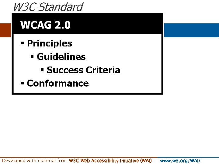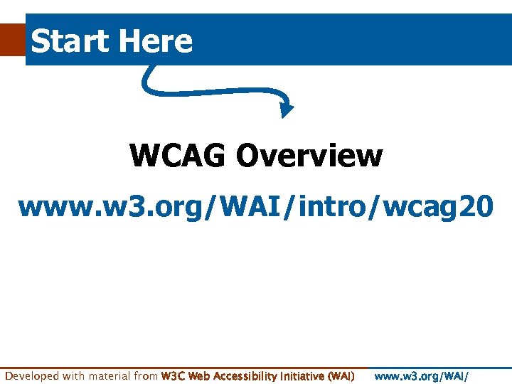 Start Here WCAG Overview www. w 3. org/WAI/intro/wcag 20 Developed with material from W 3 C Web Accessibility Initiative (WAI) www. w 3. org/WAI/