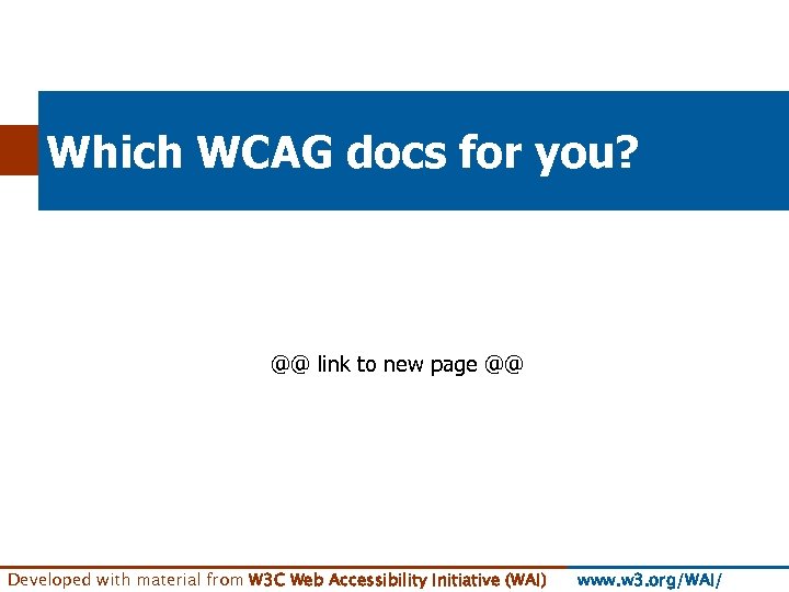 Which WCAG docs for you? @@ link to new page @@ Developed with material from W 3 C Web Accessibility Initiative (WAI) www. w 3. org/WAI/