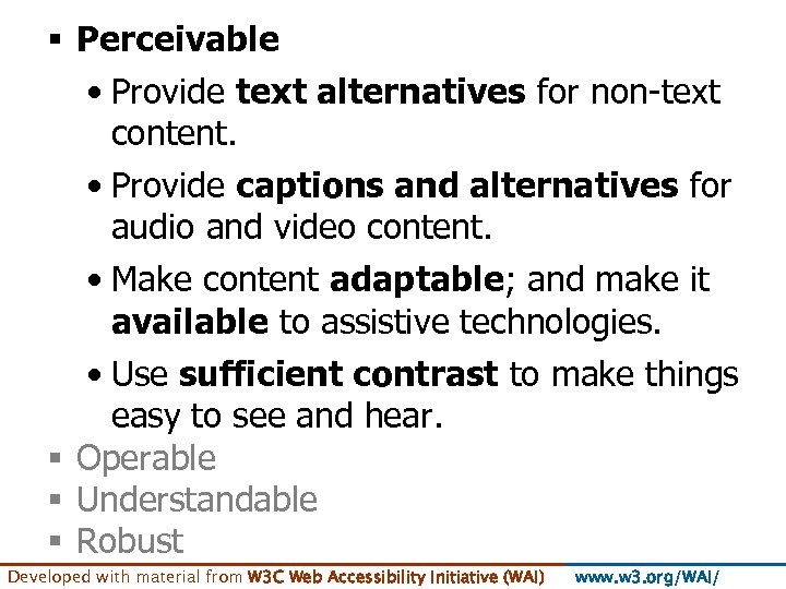 § Perceivable • Provide text alternatives for non-text content. • Provide captions and alternatives for audio and video content. • Make content adaptable; and make it available to assistive technologies. • Use sufficient contrast to make things easy to see and hear. § Operable § Understandable § Robust Developed with material from W 3 C Web Accessibility Initiative (WAI) www. w 3. org/WAI/