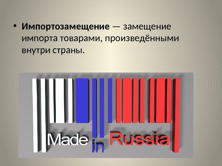 • Импортозамещение — замещение импорта товарами, произведёнными внутри страны.