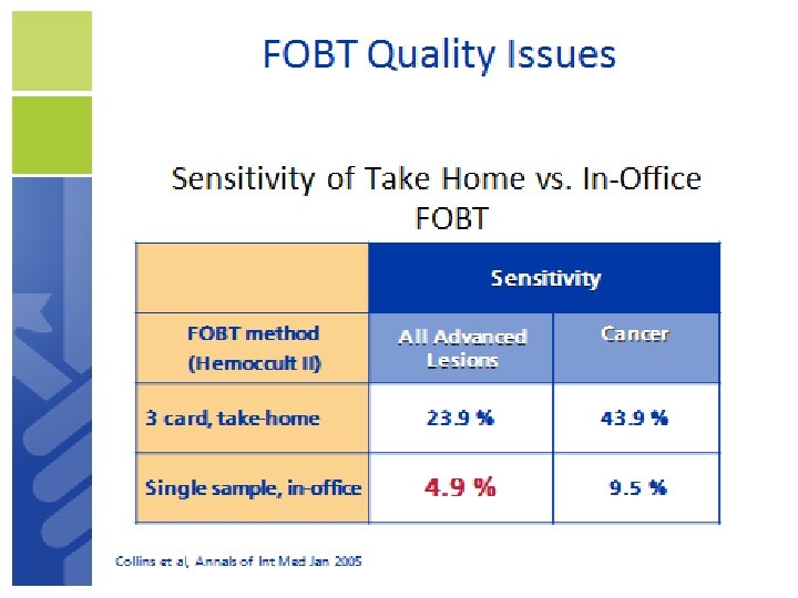 High Quality Stool Testing • CRC screening by FOBT should be performed with high-sensitivity FOBT – either FIT or a highly sensitive g. FOBT (such as Hemoccult SENSA) – Older, less sensitive guiaic tests (such as Hemoccult II) should not be used for CRC screening • Tests should be repeated yearly • In-house FOBT is essentially worthless as a screening tool for CRC and should be strongly discouraged • All positive screening tests should be evaluated by colonoscopy