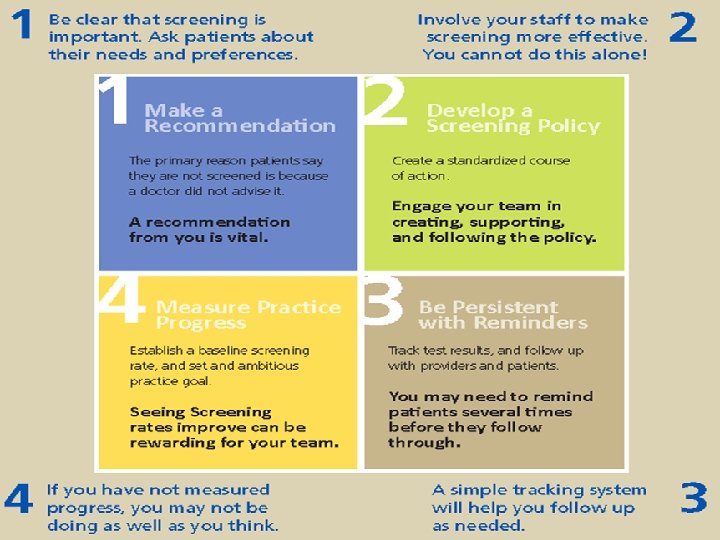 Using the Four Essentials • Be clear that screening is important, but also ask/engage your patient in the decision. • Involve clinic staff to create and implement a stronger plan using a team approach. • A simple tracking system will help you follow up with patients as needed. • Measure your progress to tell if you are doing as well as you think. Make adjustments.